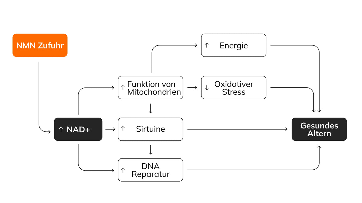 Sobald NMN in der Zelle ist, wird es durch das Enzym NMNAT in NAD+ umgewandelt. NMNAT existiert in mehreren Isoformen (NMNAT1, NMNAT2 und NMNAT3), die jeweils in unterschiedlichen Zellkompartimenten aktiv sind – wie Zellkern, Zytosol und Mitochondrien.