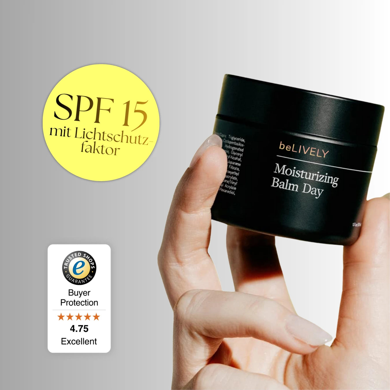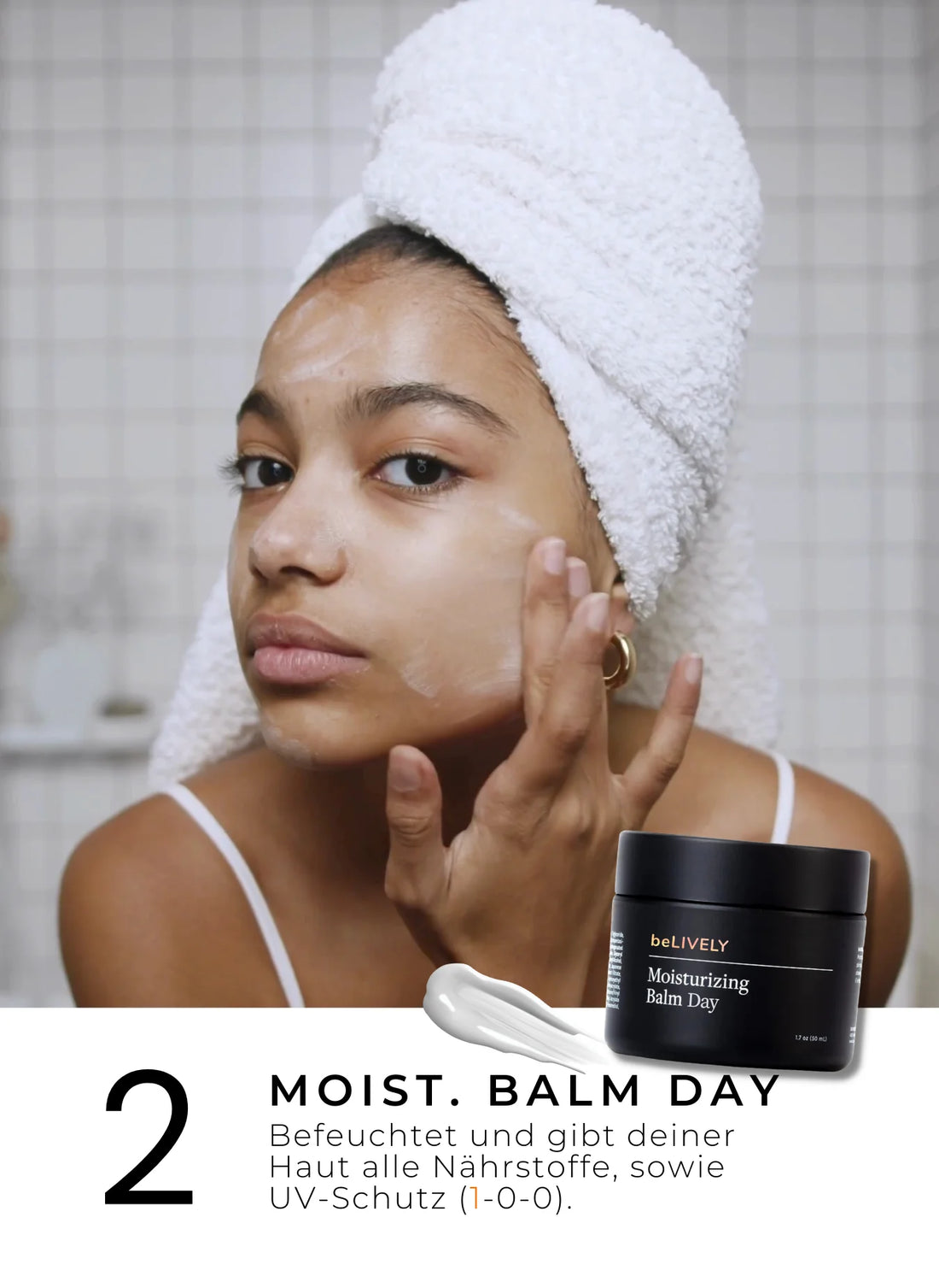 - Moisturizing Balm Day: Migliora l’idratazione dopo la prima settimana, ripara i danni cutanei dopo 3-4 settimane e protegge dai raggi UV.