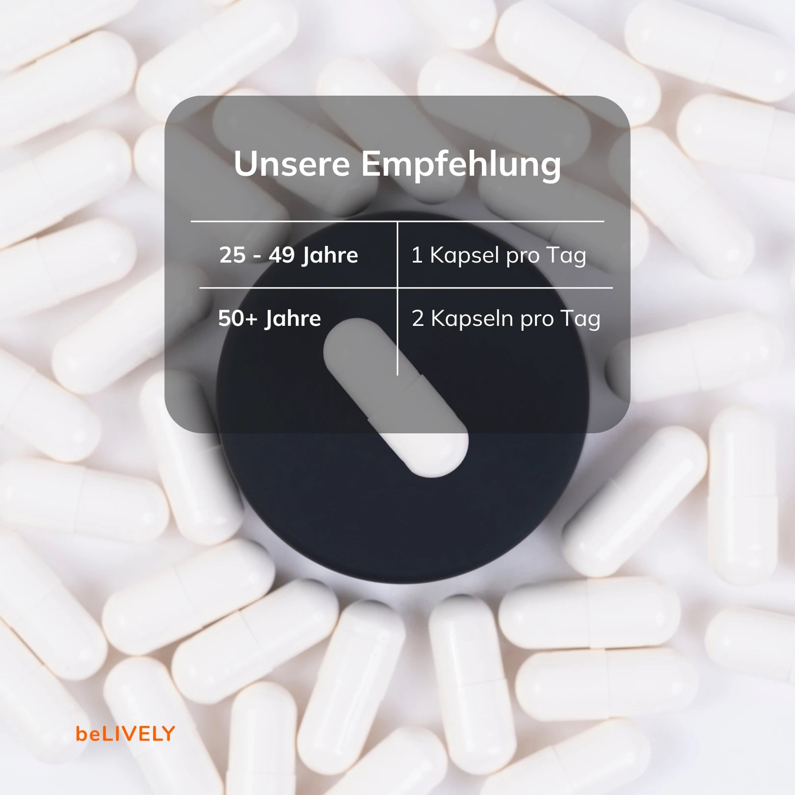 Die Einnahme hängt vom Alter ab: Von 25 bis 50 Jahren empfehlen wir eine Kapsel pro Tag, ab 50 Jahren zwei Kapseln täglich.