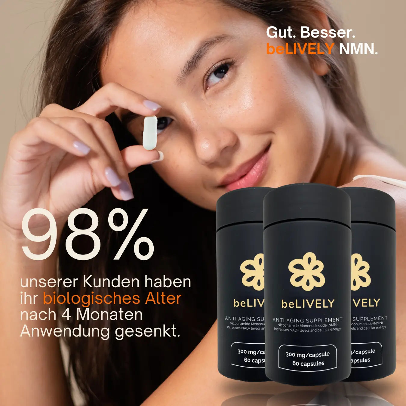 ³Shade, C. (2020, Februar). The Science Behind NMN–A Stable, Reliable NAD+ Activator and Anti-Aging Molecule. National Library of Medicine. https://www.ncbi.nlm.nih.gov/pmc/articles/PMC7238909/